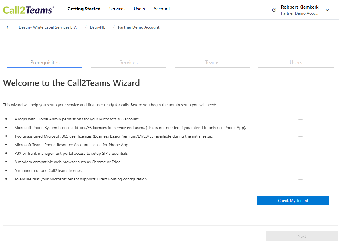 Belangrijk is dat je toegang hebt tot de tenant middels een Global Admin account en dat je een extra (niet toegewezen) Microsoft 365 licentie hebt enkel voor de configuratie). Na de configuratie mag de licentie weer worden opgezegd of toegewezen worden aan een gebruiker binnen de tenant. Zorg ook dat van te voren de te koppelen gebruikers een Teams Phone Standard licentie toegewezen hebben gekregen. Dit bevordert het gehele proces.