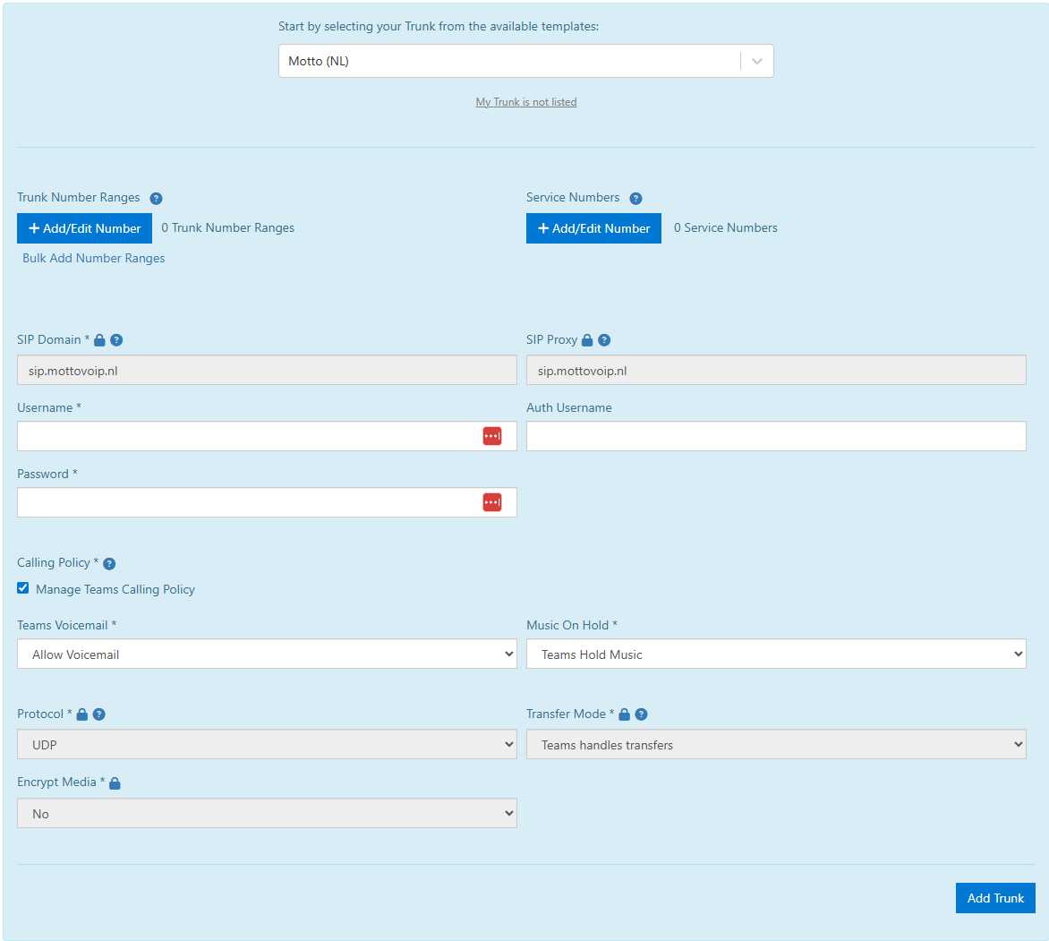 Om de dienst goed te laten werken moet Blind Trust op de betreffende trunk worden geactiveerd. Omdat je dit niet zelf kunt doen, dien je hiervoor even Support te bellen. Zij kunnen dit op verzoek activeren wanneer je via Call2Teams met Microsoft Teams gaat bellen.