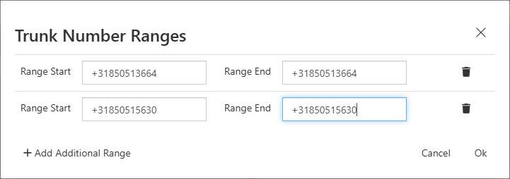 Trunk Number Ranges | Klik op Add/Edit Number om nummers toe te voegen die zijn toegekend aan de SIP Trunk. Vul ze in door een + te gebruiken voor de prefix en klik op OK als je de nummers hebt toegevoegd. |