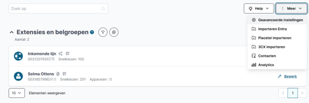 Klik in het overzicht van de Cloud PBX op het dropdownmenu "Meer" aan de rechterkant en open vervolgens de “Geavanceerde instellingen”.