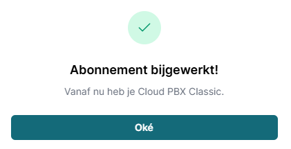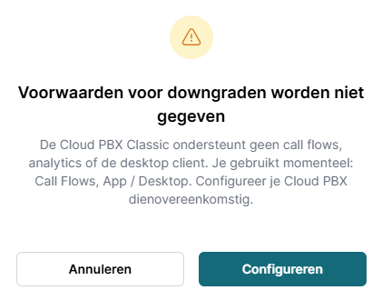 Houd er rekening mee dat bij overschakelen van de Classic of Pro Cloud PBX naar de Basic versie, alle configuratie van de Cloud PBX verloren gaat. Deze kunnen niet worden hersteld.
